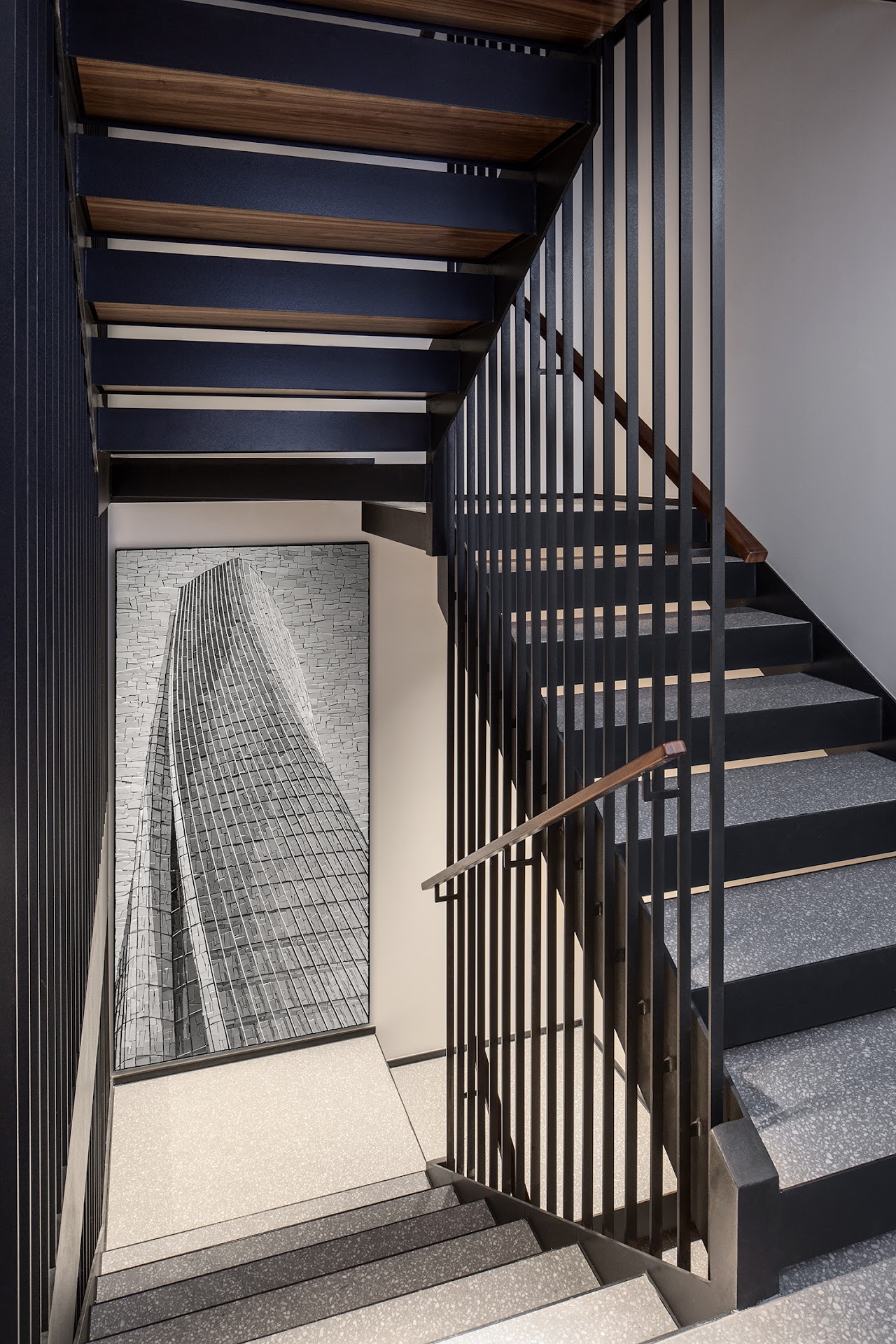 For the renovation project of an early twentieth century residential building in Milan, curated by Roberto Battistello's studio, FERRILLOBELLI designed highly representative interiors. A wide lobby, enriched with modern marbles and boiserie, opens onto a contemporary garden. The common areas are interpreted in a domestic, familiar way: comfortable seats like in a home living room, a marble library, a bar corner, a lit fireplace. The spa is a luxurious and intimate place, black granites, natural woods, soft lighting, including relaxation area, sauna, steam-room, massage corner. Even the gym preserves the warmth of home. Private meeting rooms solve the issue of contemporary home working. Oblique lines, blacks and whites meet the warmth of oak to design stairs, corridors and elevators of remarkable elegance.